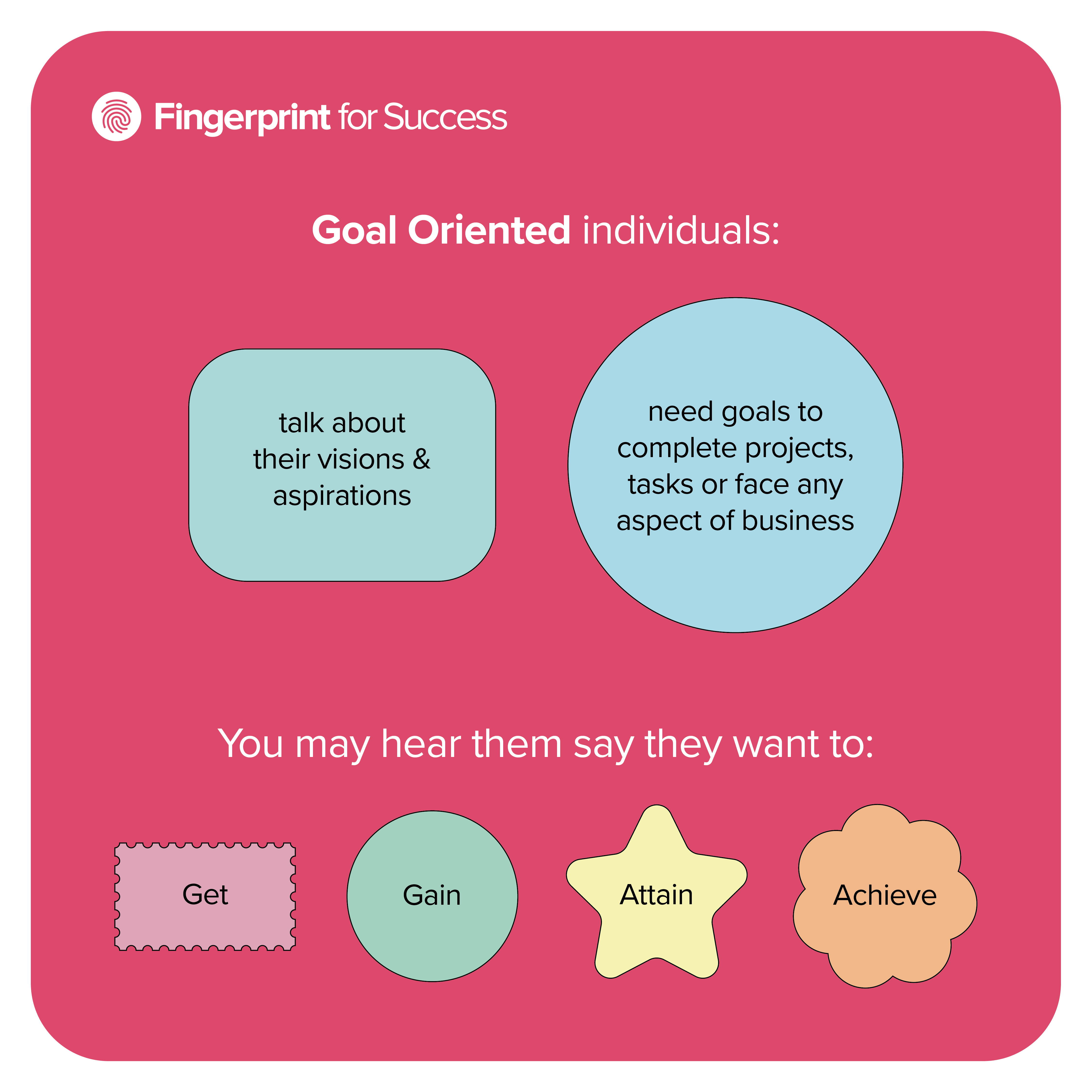 An instagram post for Fingerprint For Success, using their branding, illustration style, and color scheme to distill information from their talk on Goal Focus into five attention-grabbing slides.